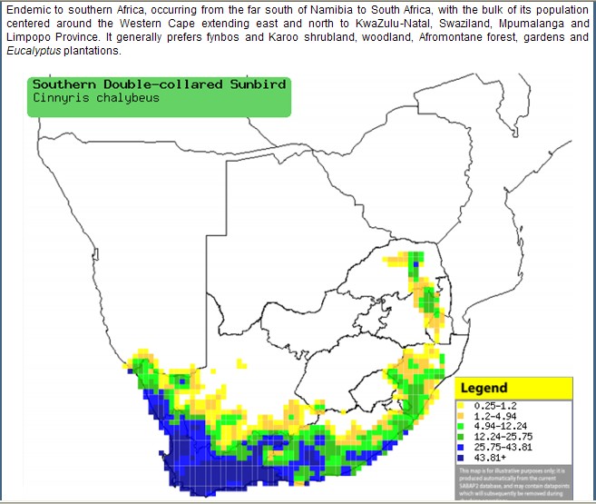 Southern Double-collared Sunbird Nectariniidae Cinnyris chalybeus Lesser Double-collared Sunbird Klein-rooibandsuikerbekkie (A) Endemic to South Africa Conservation status: Least concern MALE GALLERY: FEMALE GALLERY: